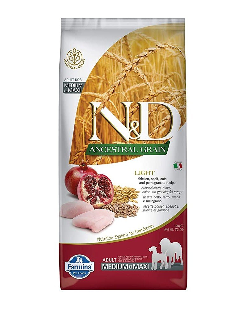 La fórmula Natural&Delicious Ancestral (ND) Light de Farmina, elaborada con ingredientes naturales y con cereales saludables como la avena y la espelta, está enfocada a perros adultos de raza mediana y grande. Los ingredientes principales son el pollo y la granada. La proteína animal alcanza en esta fórmula un 90% y está cocinada con pollo fresco deshuesado como ingrediente principal (20%).