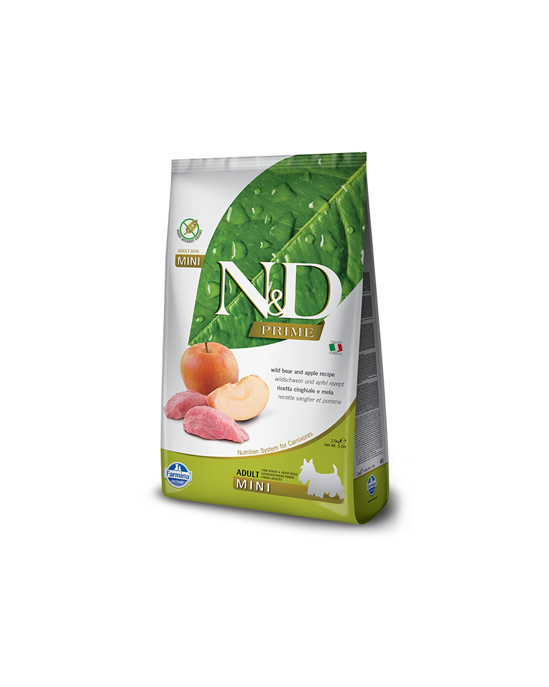 La fórmula Natural&Delicious Prime (ND) de Farmina, elaborada con ingredientes naturales y libre de cereales, está enfocada a perros adultos de raza pequeña. Los ingredientes principales son el jabalí y la manzana. La proteína animal alcanza en esta fórmula un 98% y está cocinada con jabalí fresco deshuesado como ingrediente principal (22%).